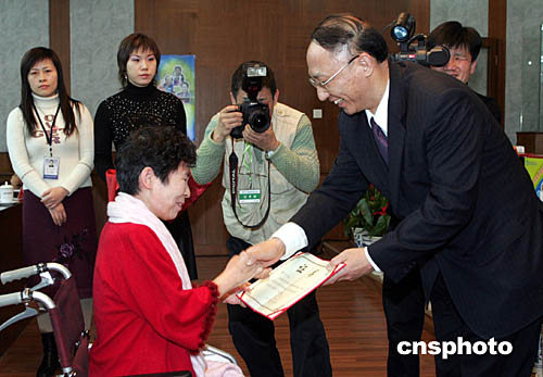 圖為中國(guó)國(guó)家體育總局局長(zhǎng)劉鵬向老運(yùn)動(dòng)員李小平頒發(fā)證書。