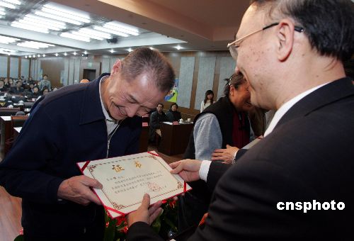 圖為中國(guó)國(guó)家體育總局局長(zhǎng)劉鵬向老運(yùn)動(dòng)員頒發(fā)證書。