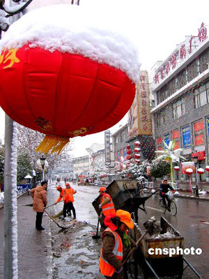 2月12日農歷正月初四,經過一夜的大雪,南京夫子廟旅游景區的路面上鋪滿了積雪。為了確保游人安全,秦淮區環衛所的工人們一清早就開始清掃路面積雪和打撈秦淮河上的漂浮物,許多市民也加入到掃雪行列。作者:孫忠南