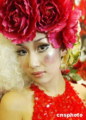 情人節到來之際,北京商家以各種不同的形式推出多種促銷活動,圖為一家色彩藝術公司在推出情人節禮盒活動時,彩妝模特配戴玫瑰花吸引顧客。作者:錢興強