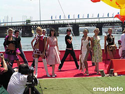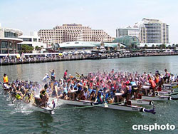 悉尼市2005年中國(guó)農(nóng)歷新年慶典活動(dòng)的壓軸戲——龍舟競(jìng)賽,于19日和20日在達(dá)令港隆重舉行。此次龍舟競(jìng)賽共有近百個(gè)龍舟隊(duì)參加,爭(zhēng)奪不同年齡組別的冠軍。上圖為開(kāi)幕典禮上的服裝表演。下圖為龍舟隊(duì)員戲水慶祝比賽開(kāi)幕.作者:劉雨生