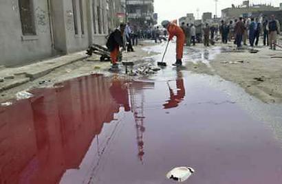 從美聯(lián)社記者拍到的電視畫面上看到,希拉鎮(zhèn)負(fù)責(zé)搶救傷員的診所外面,流了一灘一灘的鮮血。診所的墻壁上,明顯有爆炸燒焦的痕跡,幾十名伊拉克人圍在一起,幫忙把死者肢體往毯子里裝殮。在一個墻角,死傷者的鞋底和破爛的衣服堆在一起。