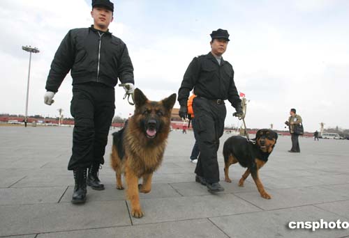 圖:警犬在天安門執行安全檢查