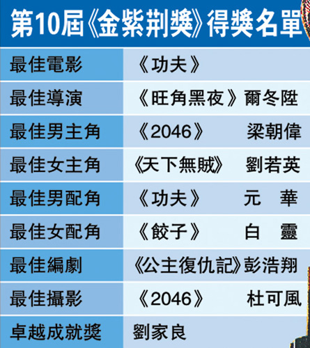 獲得本屆“金紫荊獎”十大華語片獎的影片是:《旺角黑夜》、《新警察故事》、《天下無賊》、《203040》、《2046》、《功夫》、《十面埋伏》、《大事件》、《公主復仇記》、《餃子》。
