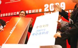 為迎接第五屆東亞運動會在香港舉行,籌委會將舉辦徽章設計比賽,主席霍震霆(左)7日在記者會上宣布詳情。作者:譚達明