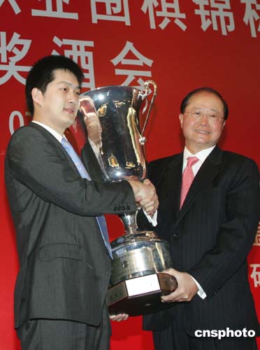 三月七日晚,中國棋手常昊從應(yīng)氏杯圍棋錦標(biāo)賽創(chuàng)立者應(yīng)昌期先生之子應(yīng)明皓手中接過第五屆應(yīng)氏杯圍棋錦標(biāo)賽冠軍獎杯。這是他個人職業(yè)生涯的首個世界冠軍頭銜,同時也是中國棋手首次在該賽事中奪冠。作者:武仲林
