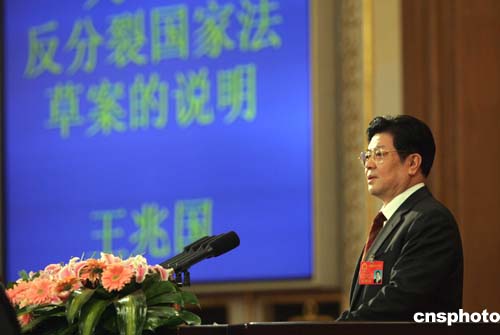全國人大常委會副委員長王兆國代表全國人大常委會在會上作關于反分裂國家法草案的說明,介紹了制定本法的必要性和可行性、起草本法的原則和草案的形成以及草案的主要內容。