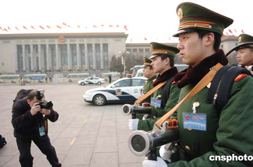 三月九日,一位采訪“兩會”的攝影記者在天安門廣場拍攝值勤的武警戰士。作者:陳文