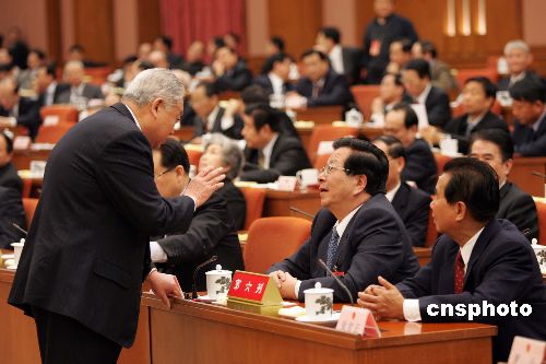 十屆全國人大三次會議主席團第三次會議三月十日在北京人民大會堂舉行,出席會議的曾慶紅、吳官正與盛華仁(左)一起交談。作者:毛建軍
