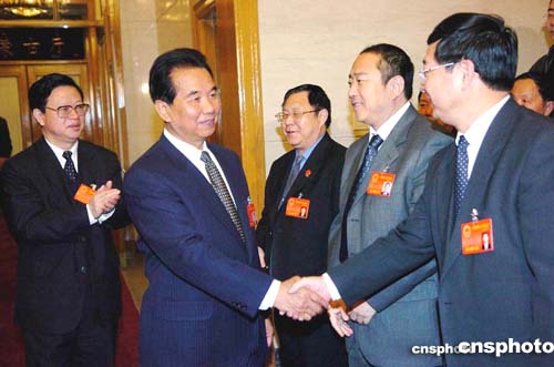 中共中央政治局常委吳官正三月十一日上午到全國人大貴州代表團與代表一起審議“兩高”報告。作者:陳文