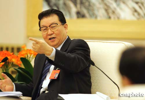 中共中央政治局常委李長春,三月十一日到全國人大陜西代表團和代表們一起審議人大常委會工作報告、“兩高”報告。作者:湯彥俊