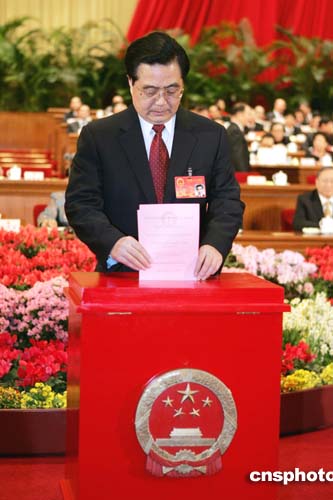 十屆全國人大三次會議三月十三日上午在北京人民大會堂舉行第四次全體大會,代表們投票選舉中華人民共和國軍事委員會主席。圖為胡錦濤投票。作者:毛建軍