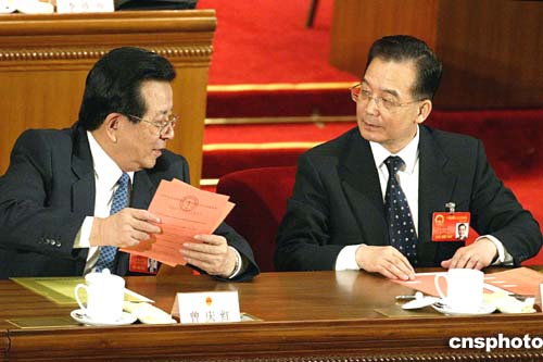 十屆全國人大三次會議第四次全體大會三月十三日在北京人民大會堂召開,胡錦濤當選為中華人民共和國中央軍事委員會主席。圖為國務院總理溫家寶和國家副主席曾慶紅領到選票。作者:廖文靜
