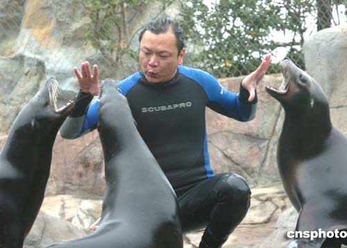 香港海洋公園的喂養員在每日喂海獅之前都要與海獅進行交流﹐以增進感情。作者:趙振清