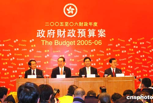 香港財政司司長唐英年16日在香港公布了香港05-06年度財政預算報告﹐在傍晚時分與其它官員一起出席在政府合署舉行的記者會。作者:趙振清