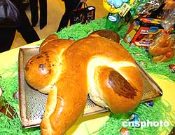 香港一家食品店,復活節前夕出爐10磅復活兔面包展示,以搶占節日商機。作者:宋吉河