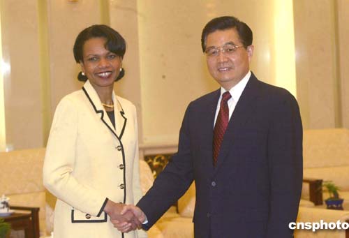 中新社北京三月二十日電(記者齊彬)中國國家主席胡錦濤今天下午在人民大會堂會見了美國國務卿賴斯。