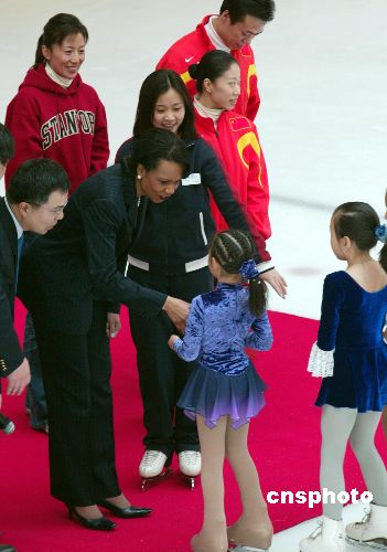 美國國務卿賴斯三月二十一日在北京與中國花樣滑冰愛好者親切交流,中國著名雙人滑選手申雪、趙宏博、冬季奧運會金牌選手楊陽等陪同出席活動。作者:滿會喬