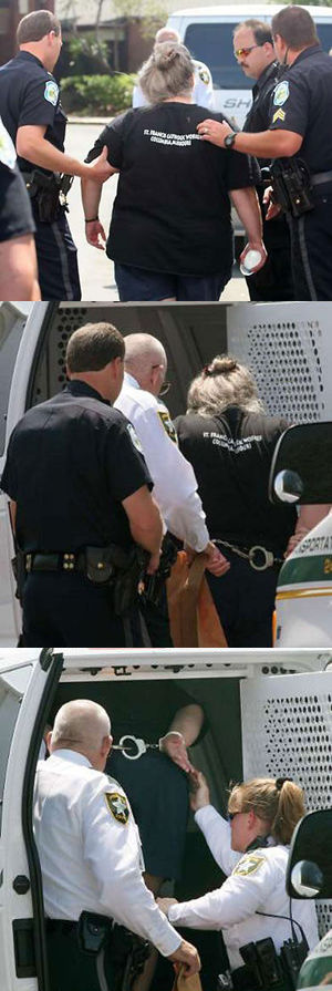 圖為當地圣弗朗西斯市天主教工作人員賈科布被佛羅里達州警方以“非法侵入他人領地”罪逮捕。賈科布試圖偷偷將一瓶水帶給植物人夏沃。(固山)