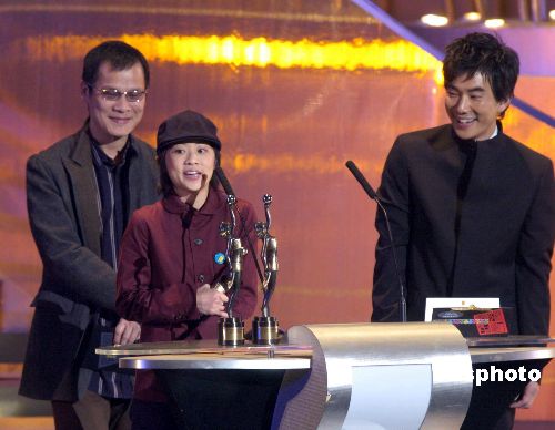 “第廿四屆香港電影金像獎頒獎典禮”3月27日晚于“紅館”舉行,來港的嘉賓羅大佑、任賢齊為獲得最佳原創電影歌曲獎的The Pancakes頒獎。作者:洪少葵