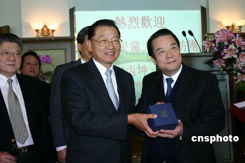 中國(guó)國(guó)民黨副主席江丙坤一行三十日中午在南京會(huì)見(jiàn)江蘇臺(tái)商。他表示,臺(tái)商在江蘇得到最好的照顧,他們的事業(yè)大部分都相當(dāng)?shù)某晒。臺(tái)商在這里的發(fā)展對(duì)大陸的經(jīng)濟(jì)發(fā)展也有相當(dāng)大的貢獻(xiàn)。但是,兩岸人民不但祈求經(jīng)濟(jì)的繁榮,更希望兩岸的和平,因?yàn)閮砂兜暮推讲拍軒?lái)兩岸的繁榮。圖為江丙坤向江蘇臺(tái)商贈(zèng)送禮品。作者:陳旻
