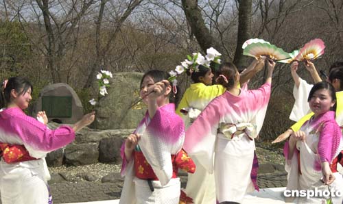 日本創價大學校園內三日舉行傳統的“周櫻”觀賞會。三十年前,在創價學會會長池田大作的提議下,首批留學創價大學的六名中國留學生種植櫻花樹苗,被命名為“周櫻”。此后,每年春暖花開時節的“周櫻”觀賞會,便成為此間日本友人緬懷周恩來的一項傳統活動。圖為在“周櫻”紀念碑前,創價大學學生手持櫻花翩翩起舞。作者:王健