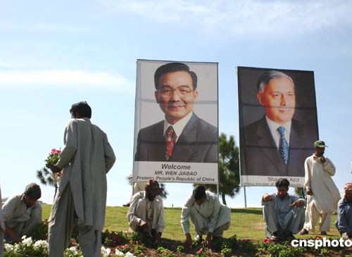 為了迎接中國(guó)總理溫家寶對(duì)巴基斯坦的正式訪問,巴方在總統(tǒng)府前的迎賓大道兩側(cè)樹立起兩國(guó)領(lǐng)導(dǎo)人的巨幅畫像。伊斯蘭堡市政局員工阿亞杰馬說,為了表達(dá)對(duì)中國(guó)客人的歡迎和尊敬,“我們希望用我們所能想出的最熱烈的方式歡迎溫家寶總理”。作者:齊彬