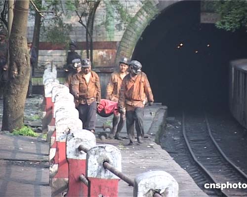 四月五日下午二時十五分,位于重慶市合川境內的天府礦業公司三匯一礦發生煤與瓦斯突出特大事故,目前有一人遇難,二十二人生死不明。 圖為遇難礦工尸體被抬出井口。作者:郭晉嘉