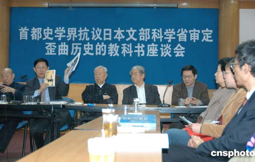四月六日,“首都史學(xué)界抗議日本文部科學(xué)省審定歪曲歷史的教科書座談會”在北京舉行。來自首都史學(xué)界的專家學(xué)者就日本文部科學(xué)省四月五日審定通過了歪曲歷史的二零零六版《新歷史教科書》事件進(jìn)行座談,并一致認(rèn)為日本政府應(yīng)當(dāng)高度重視亞洲近鄰的正義呼聲,本著對歷史認(rèn)真負(fù)責(zé)的態(tài)度,誠實履行反省侵略歷史的承諾,切實妥善處理這一問題。作者:徐曦弋