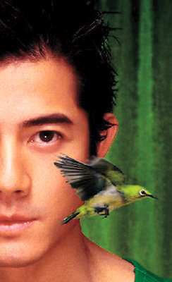 拍攝當(dāng)日,上海正值嚴(yán)寒夜,偌大的影樓更顯得寒氣逼人,當(dāng)人人身穿羽絨,唯獨(dú)城城背心一度,把他冷得手腳僵硬,大家見狀,急忙張羅暖風(fēng)機(jī)圍著“城城”,讓他取暖。原本有準(zhǔn)備長(zhǎng)袖綠衣造型,但愛漂亮的“城城”堅(jiān)決穿背心上陣。至于何以選用綠色與青鳥作今次海報(bào)的主調(diào)?“阿叔”表示:“因?yàn)榫G色是今年流行的顏色,至于青鳥,可以是喜鳥,也可以是躍動(dòng),可以有好大想象空間。”拍攝時(shí),“城城”坐在綠布幕前,加上燈光營(yíng)造,他仿如綠翡翠般亮麗,甚具王者氣派。