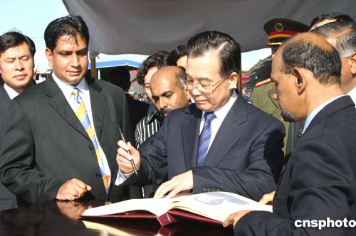 中國國務院總理溫家寶今天下午抵達斯里蘭卡首都科倫坡,圖為溫家寶在金書上題字留念。作者:齊彬