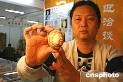 四月十四日,二○○五中國國內旅游交易會在廣西桂林開幕。廣西民間藝術家陳樺鳴攜“蛋琢”繪畫藝術亮相“旅交會”。陳樺鳴的蛋琢繪畫曾獲廣西特色旅游工藝品設計大賽銀獎。圖為陳樺鳴在向游客展示雕琢有毛澤東頭像的“蛋琢”繪畫品。作者:蔣雪林