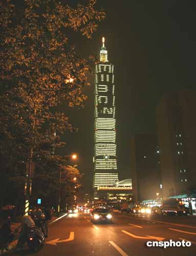 世界第一高樓臺北101大樓十九日晚七時許,呼應“讓物理光耀世界”的活動,在耀眼的高空焰火燃放之后,五百零八米高度的大樓從上往下將相對論的公式“E=mc2”的燈光點亮,以紀念愛因斯坦發表相對論一百周年。作者:楊伏山