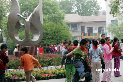 陜西西安后宰門小學的學生們在上課前做游戲。這所小學的前身是中國國民黨主席連戰(zhàn)先生小學時的母校。四月三十日,來大陸訪問的中國國民黨主連戰(zhàn)將來此造訪。作者:武仲林