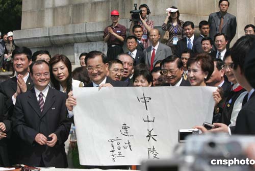 進入墓室憑吊中山先生后,連戰在訪問團成員簇擁下,于祭堂前上千名市民、游客及在場記者關注下,提筆為中山陵寫下“中山美陵”四個大字,全場以熱烈掌聲來回應。一九一二年四月一日,孫中山與胡漢民等在紫金山一帶打獵,并表示逝世后,當向國民乞求這塊土地以安葬。一九二五年在北京彌留之際,仍以歸葬鐘山為囑;同年三月十二日孫中山先生在北京辭世,當時國民政府很快選墓址于南京紫金山;一九二九年六月一日,舉行奉安大典,將中山先生遺體由北京遷葬于南京。中山陵從此在全體中國人心中同享崇高地位。