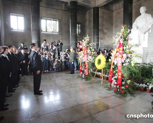 二十七日九時二十四分,肅立、敬獻鮮花、司儀恭讀《祭告總理文》,中國國民黨主席連戰與國民黨大陸訪問團全體團員在肅穆莊嚴的中山陵祭堂孫中山先生坐像前深深三鞠躬。