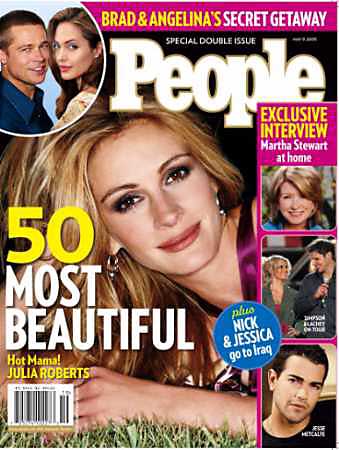 去年11月生下龍鳳胎的茱麗亞·羅伯茨則上了雜志“最有魅力50人”這期的封面,這份特刊將于周五發(fā)行。羅伯茨因此也創(chuàng)下一項(xiàng)紀(jì)錄:三次登上“最有魅力人物”的封面,9次被提名。