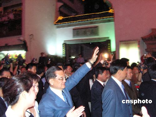 4月27日,中國國民黨主席連戰(zhàn)夫婦在夫子廟狀元樓酒店品嘗泰淮小吃晚宴后,攜夫人連方瑀女士輕松夜游秦淮河。晚8時許,連戰(zhàn)主席餐后步行走出狀元樓酒店,在夫子廟流連的燈光中,沿街兩旁的市民擊掌慶賀,連戰(zhàn)微笑著向行人致意。整個游覽過程大約在半小時左右。作者:水從澤