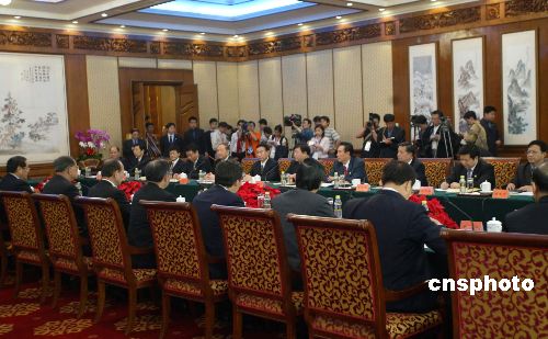 四月二十八日,中國國民黨大陸訪問團與中共中央臺辦在北京釣魚臺會談,就二十九日兩黨主席會談的細節及使兩黨在交往互動中創造機制化、制度化交換意見。中臺辦主任陳云林(右四)與中國國民黨秘書長林豐正出席會談。作者:史利