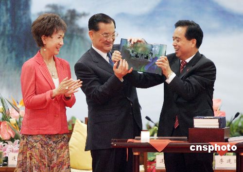 中共陜西省委書記李建國四月三十日晚在西安會見并宴請中國國民黨主席連戰和他率領的大陸訪問團成員。圖為連戰向李建國回贈禮物。作者:毛建軍