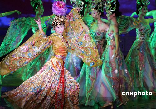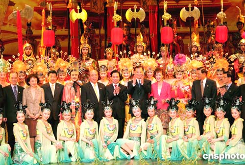中國國民黨主席連戰(zhàn)和他率領(lǐng)的國民黨大陸訪問團(tuán)成員,四月三十日晚在西安“大唐芙蓉園”觀看大型詩樂舞劇《夢(mèng)回大唐》,并與演員們合影。作者:毛建軍