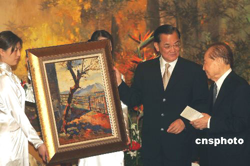 連戰(zhàn)向汪道涵轉(zhuǎn)交辜振甫當(dāng)年的畫作《陽明山莊》。作者:毛建軍