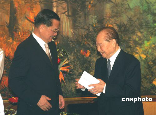 中國國民黨主席連戰(zhàn)今日(2日)上午,在上海錦江飯店小禮堂與海協(xié)會會長汪道涵會面。