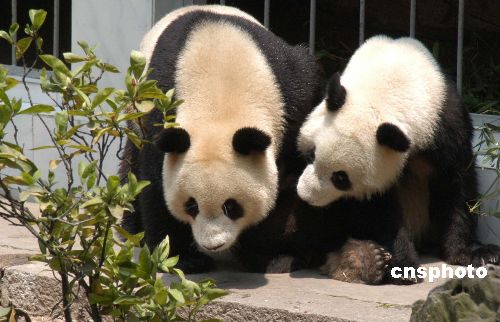 落戶福州大熊貓研究中心僅十八天的來自四川臥龍大熊貓研究中心的大熊貓——“福福”(左一)、“林陽”(右一),“五一”節首次與游人見面。作者:劉可耕