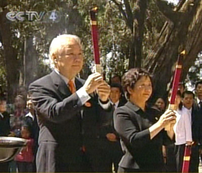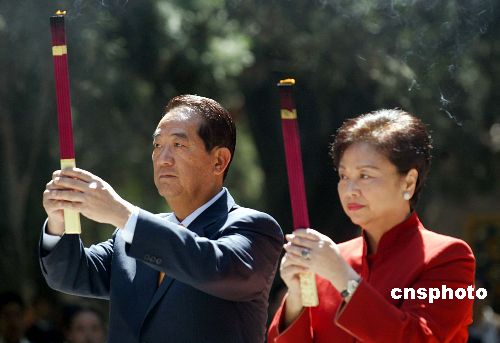 五月六日,由親民黨主席宋楚瑜率領的親民黨大陸訪問團前往陜西黃帝陵拜謁。圖為宋楚瑜、陳萬水夫婦在黃帝陵前上香。作者:廖文靜