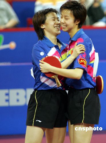 王楠/張怡寧在上午的半決賽中淘汰了中國香港的帖雅娜/張瑞,牛劍鋒/郭躍則淘汰了另一對中國選手白楊/郭焱進入決賽。今晚的決賽雙方打得并不精彩,作為世乒賽和奧運會女雙冠軍的王楠/張怡寧實力明顯占優,她們在比賽中表現得非常保守,希望能平穩地奪冠,而牛劍鋒/郭焱居然順著對手的節奏進行比賽,雖然最后時刻牛劍鋒/郭躍試圖放手一搏,但比分上的差距已經無法挽回,她們只能再次屈居亞軍。