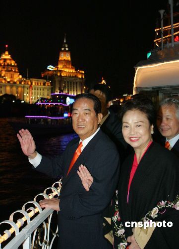 中新社上海五月七日電(記者許曉青 曾嘉)華燈璀璨,在一陣陣江南童謠聲中,親民黨主席宋楚瑜攜夫人陳萬水登上了“上海風采”號游船,夜游黃浦江。宋楚瑜夫婦在船舷上感慨:“百聞不如一見”,宋楚瑜還饒有興致地操起滬語,驚嘆說:“變化大得不得了!”