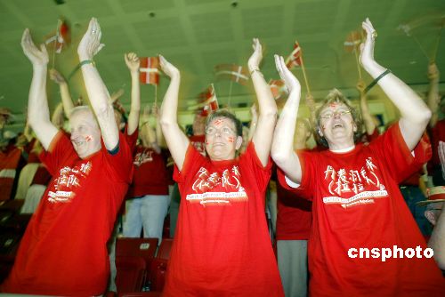 在小組賽的比賽中,看臺上為丹麥選手加油助威的丹麥羽毛球拉拉隊人數不多,但聲勢浩大,拉拉隊的不少成員是老年人。作者:盛佳鵬