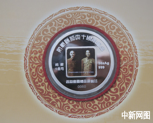 紀念幣正面是中國抗戰時的國共兩黨領袖的合影,背面是中國軍民奔赴抗戰前線,浴血奮戰的浮雕。紀念幣用5盎司純銀鑄造,面值300美元,全世界發行1000枚。