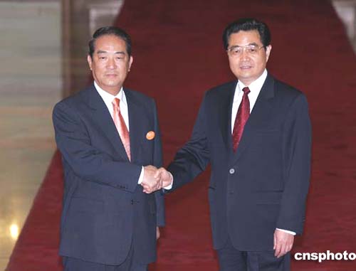 中新社北京五月十二日電 (記者劉舒凌)自人民大會堂現場報道:五月十二日下午三時許,中共中央總書記胡錦濤與親民黨主席宋楚瑜在北京人民大會堂北大廳握手。這是兩黨最高領導人首次會面。